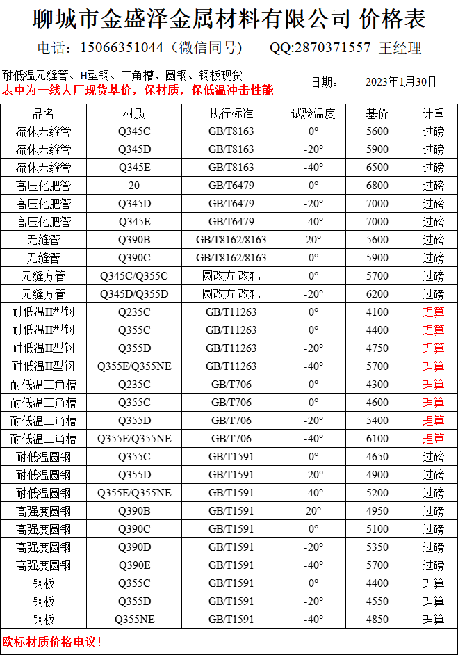 聊城市金盛澤金屬材料有限公司主營(yíng)低合金/耐低溫?zé)o縫管,方矩管,H型鋼,工字鋼,角鋼,槽鋼,圓鋼,鋼板;現(xiàn)貨供應(yīng):大無(wú)縫、包鋼、煙寶、鳳寶正品耐低溫?zé)o縫管,專業(yè)加工生產(chǎn)無(wú)縫方矩管;經(jīng)營(yíng)一線品牌型材:萊鋼/包鋼/馬鋼/日鋼 耐低溫Q235B/C;Q355B/C/D/NE H型鋼(100*100-1000*300) 偏型號(hào)H型鋼鋼現(xiàn)貨:250/255,248/124,344/348,394/398,506/201,606/201,458/417,912/302,692/300,792/300 ;萊鋼/馬鋼/宣鋼產(chǎn) 耐低溫槽…